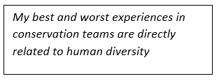My best and worst experiences in conservation teams or sustainable development projects are both directly related to diversity or differences in the people I am working with. In some cases, those differences lead to innovative, creative and exciting outcomes.
