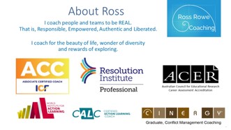I (Ross) designed this training to clearly set out the theory and principles of professional coaching whilst providing the opportunity for every participant to practice and receive immediate feedback on what was working well for them and things they might do to be more effective.