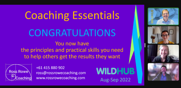 A big thank you to Ross for providing this valuable Coaching Essential course! It was an amazing experience to be able to connect and train alongside peers across our timezones from early morning in Ecuador (Alan) to late evening in Australia (Ross)! I particularly enjoyed our coaching practice sessions during our calls, alongside our ‘homework’ to hone our coaching skills in our daily lives” (Thirza Loffeld, WildHub Community Manager and WildHub Coach).