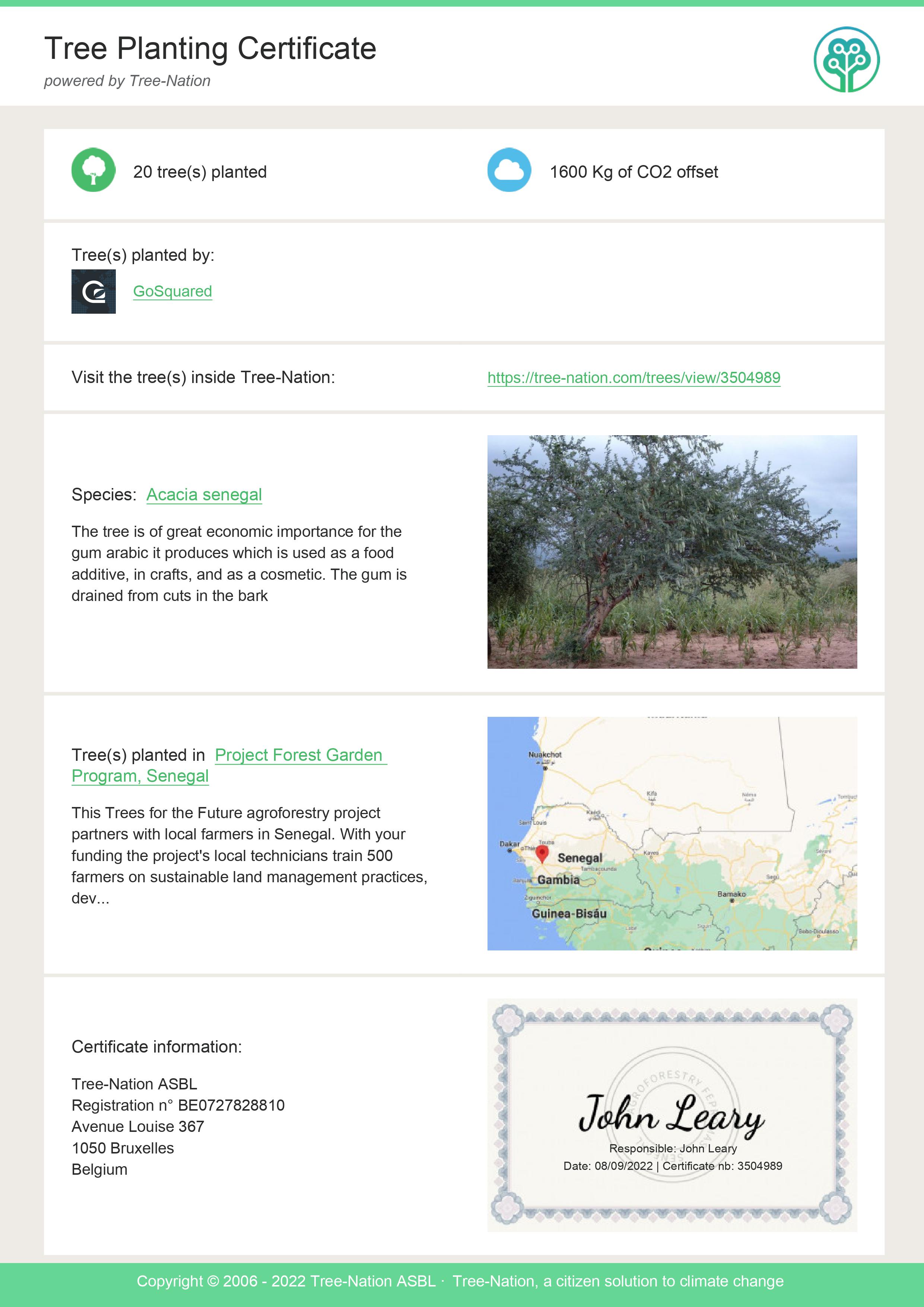 Considering all the conservation work WildTeam does, it felt appropriate you should be one of the first! Here is your certificate showing the trees that have already planted. We've chosen the Forest Program in the Fattick & Kaolack region in Senegal to plant the trees. Thank you for all your conservation inspiration on the WildHub community! We’ve planted 20 trees for you in the GoSquared Forest as part of our ongoing efforts to off-set email carbon emissions” (The GoSquared Team).