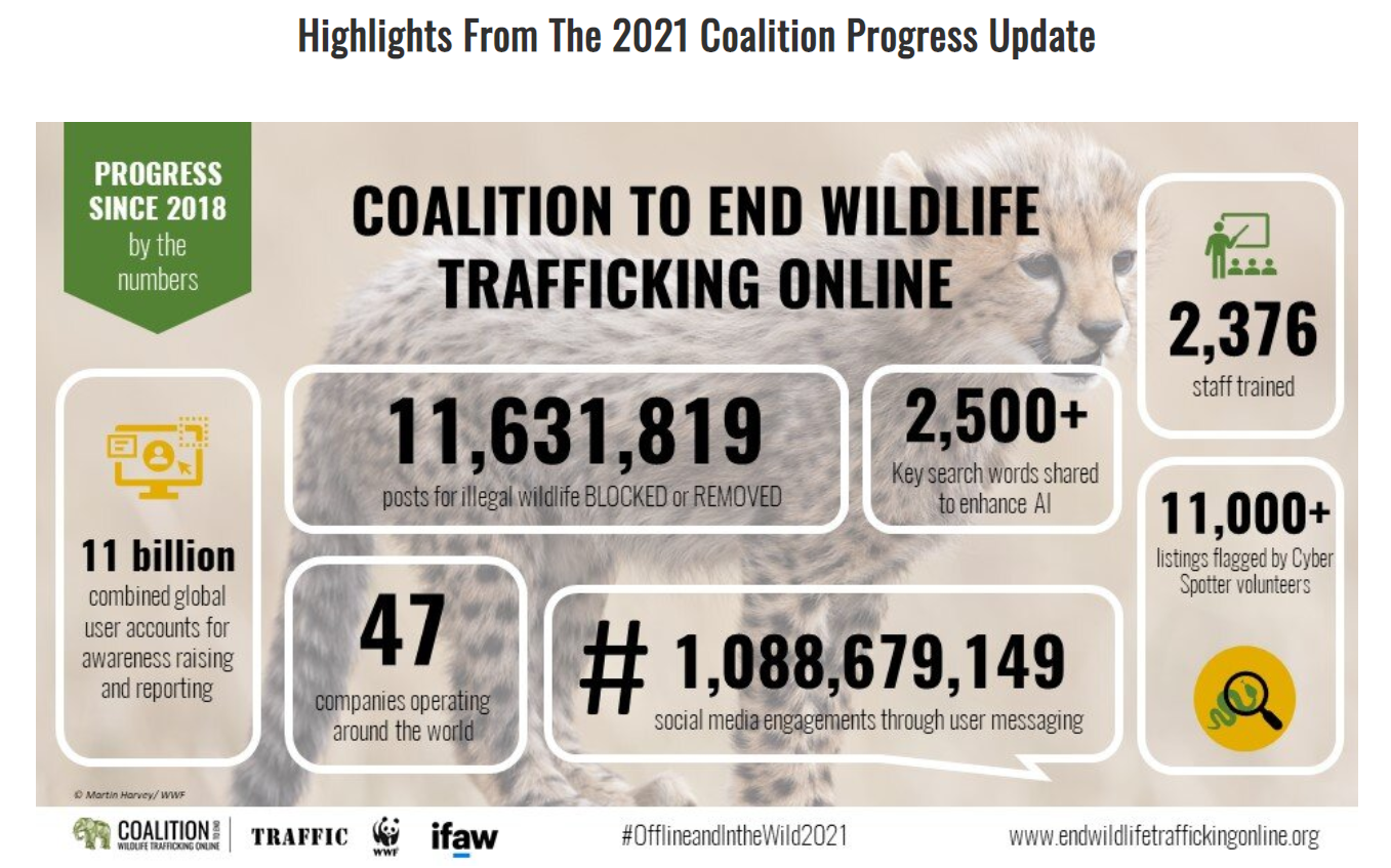 A major breakthrough in this direction was formation of “Coalition to End Wildlife Trafficking Online” in 2018. WWF, TRAFFIC and IFAW are collaborating with the digital companies across continents to unite the industry and maximize impact for reducing wildlife trafficking online. The number of internet companies of this Coalition has increased from 21 in 2018 to 47 in 2021.