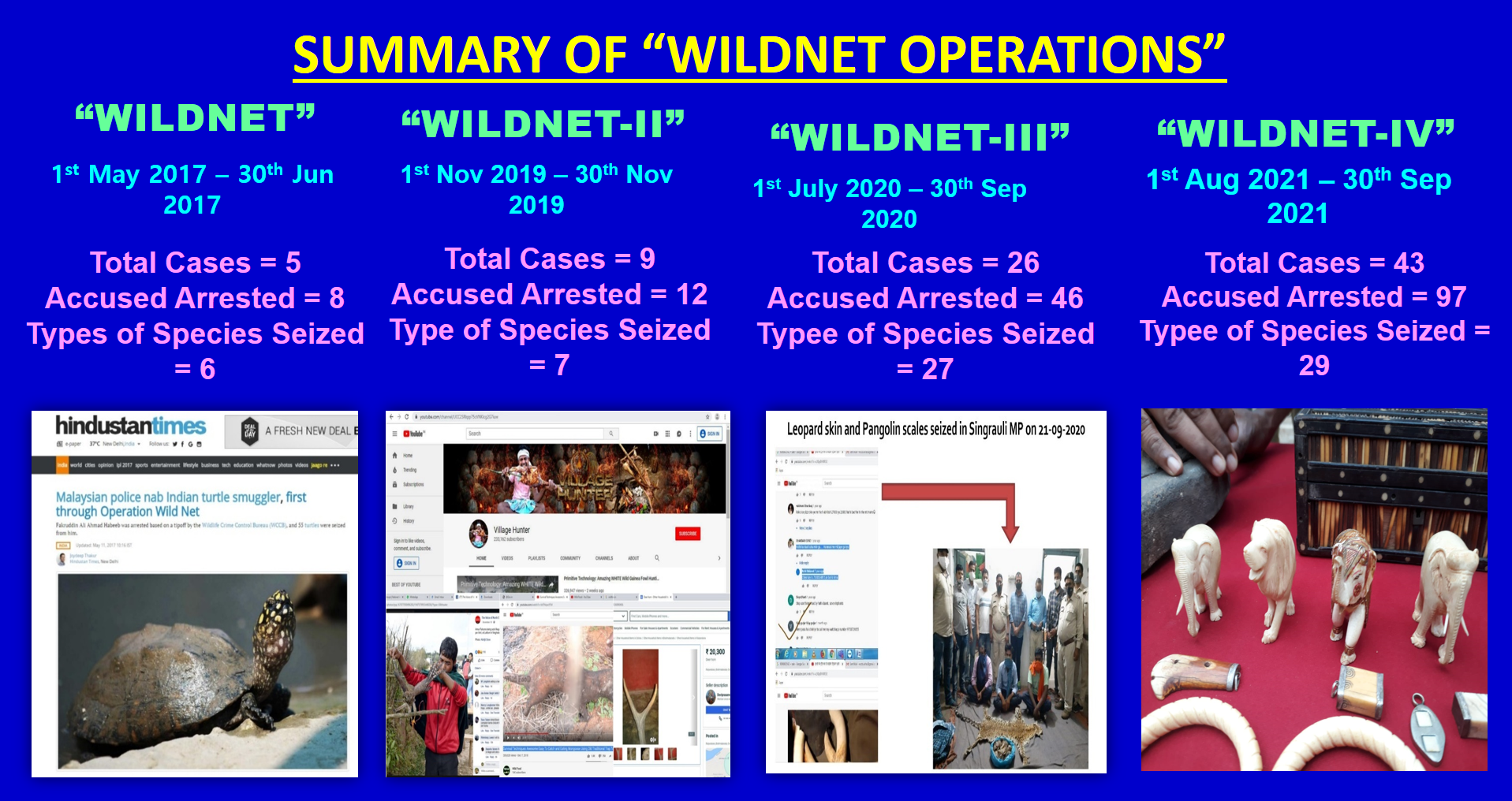 - Conducting nation wide special operation called “Operation WildNet” focused towards countering wildlife cyber crimes. All enforcement agencies in India participate in this special operation. WCCB has successfully conducted Four “Operation WildNet” till date which resulted in busting many wildlife cyber crimes through various digital platforms, seizure of huge wildlife contrabands and arrest of many cyber wildlife traffickers. Brief of the outcome of these Four “Operation WildNet” are as follows:
