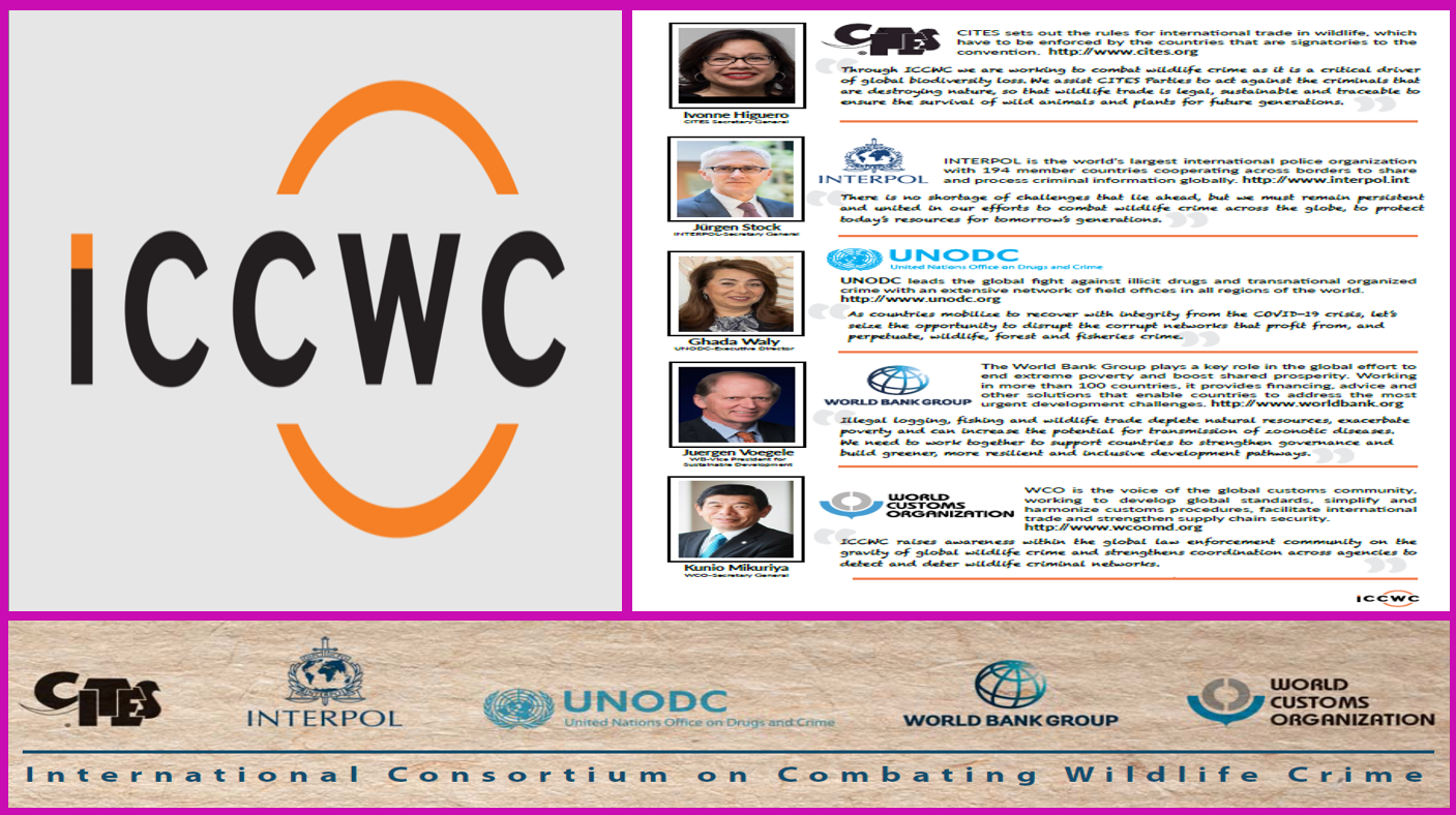 The International Consortium on Combating Wildlife Crime (ICCWC) is an example of synergy among global organizations to fight the menace of wildlife crime. It is a collaborative effort of five inter-governmental organizations namely the Convention on International Trade in Endangered Species of Wild Fauna and Flora (CITES) Secretariat, INTERPOL, the United Nations Office on Drugs and Crime (UNODC), the World Bank and the World Customs Organization (WCO). ICCWC provides coordinated support to the national wildlife law enforcement agencies and to the sub-regional and regional networks.