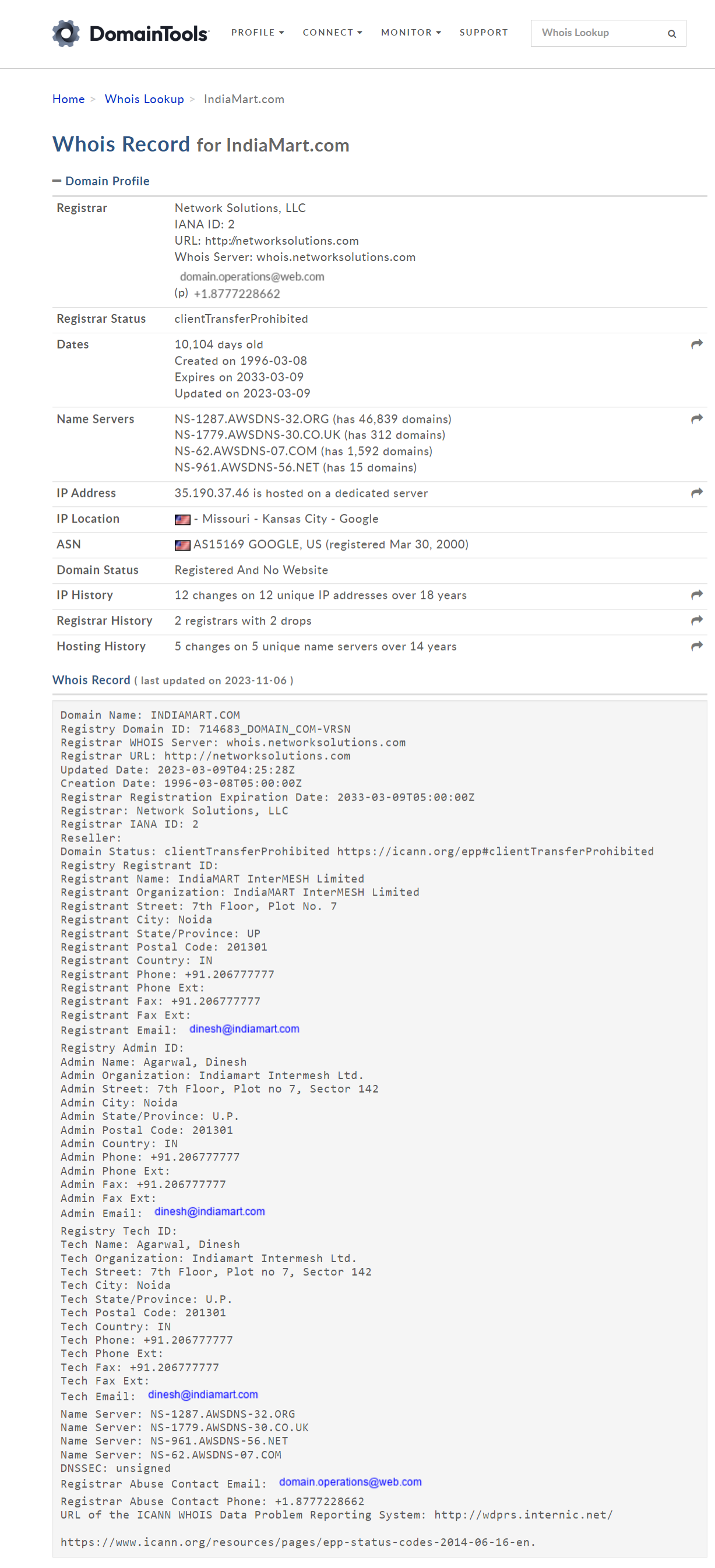 The wildlife crime investigator can collect crucial details about this website using DNS Analysis Tools as discussed hereinabove. The details that can be obtained are shown below using DomainTools: