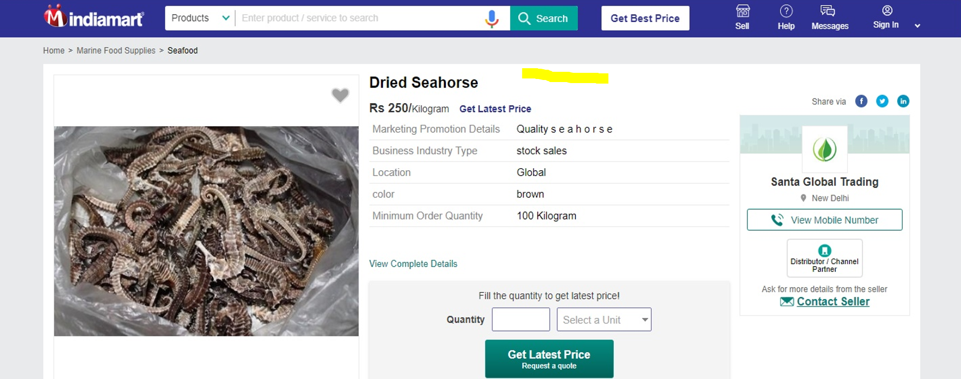There are many tools that can be utilized by the wildlife law enforcement agencies such as whois.com, MxToolbox, GoDaddy, ICANN Lookup, domain.com etc. for analysis of the domain names. Using these tools, wildlife crime investigators can forensically analyze a website found to be involved in trade of protected species of flora and fauna. For example, while doing cyber patrolling, wildlife enforcement officer finds that a website called IndiaMart.com is being used for trade of protected species of wildlife as shown below: Dried SeaHorse (a protected species under Wild Life (Protection) Act) is being offered for sale.