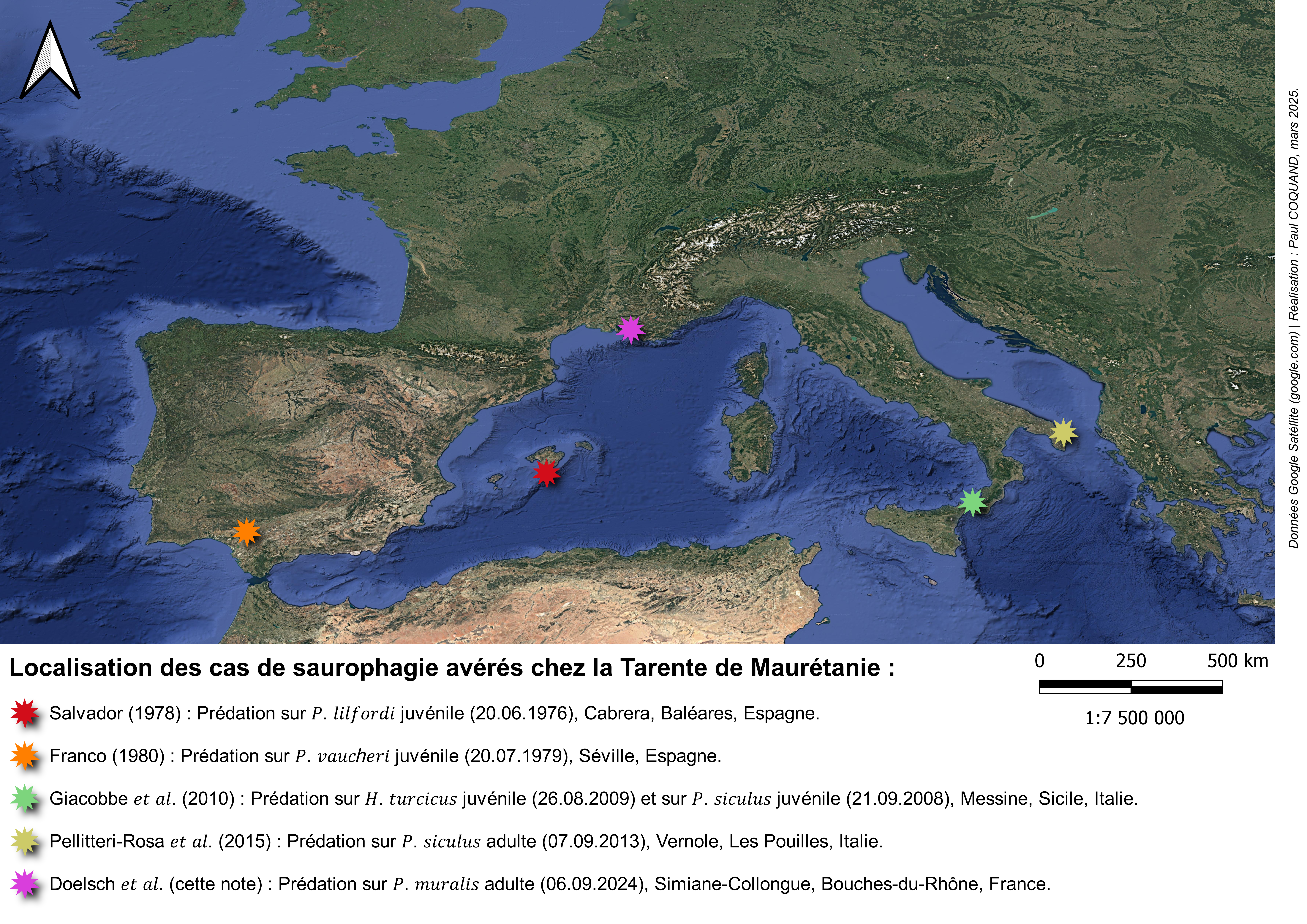 🕵Unfortunately, many sources mention saurophagy in T. mauritanica without giving details of the species consumed. Salvador (1978) speculates on possible predation on juveniles of H. turcicus, while González de la Vega (1988) discusses cannibalism in juveniles of T. mauritanica. Schleich et al. (1996) assert that T. mauritanica, at least in captivity, can exhibit cannibalistic behavior. Picariello (1996), on the basis of personal observations, states that T. mauritanica may feed “perhaps on smaller geckos”. Rieppel (1981) also adds P. siculus to the species' spectrealimentary list, on the basis of an unpublished observation by W. Böhme in Italy, for which no precise details are given. In France, Fretey (1987) mentioned the predation of T. mauritanica on juvenile wall lizards and Vacher and Geniez (2010) on P. liolepis (Boulenger, 1905), unfortunately without giving any further details: neither photographic evidence nor location.