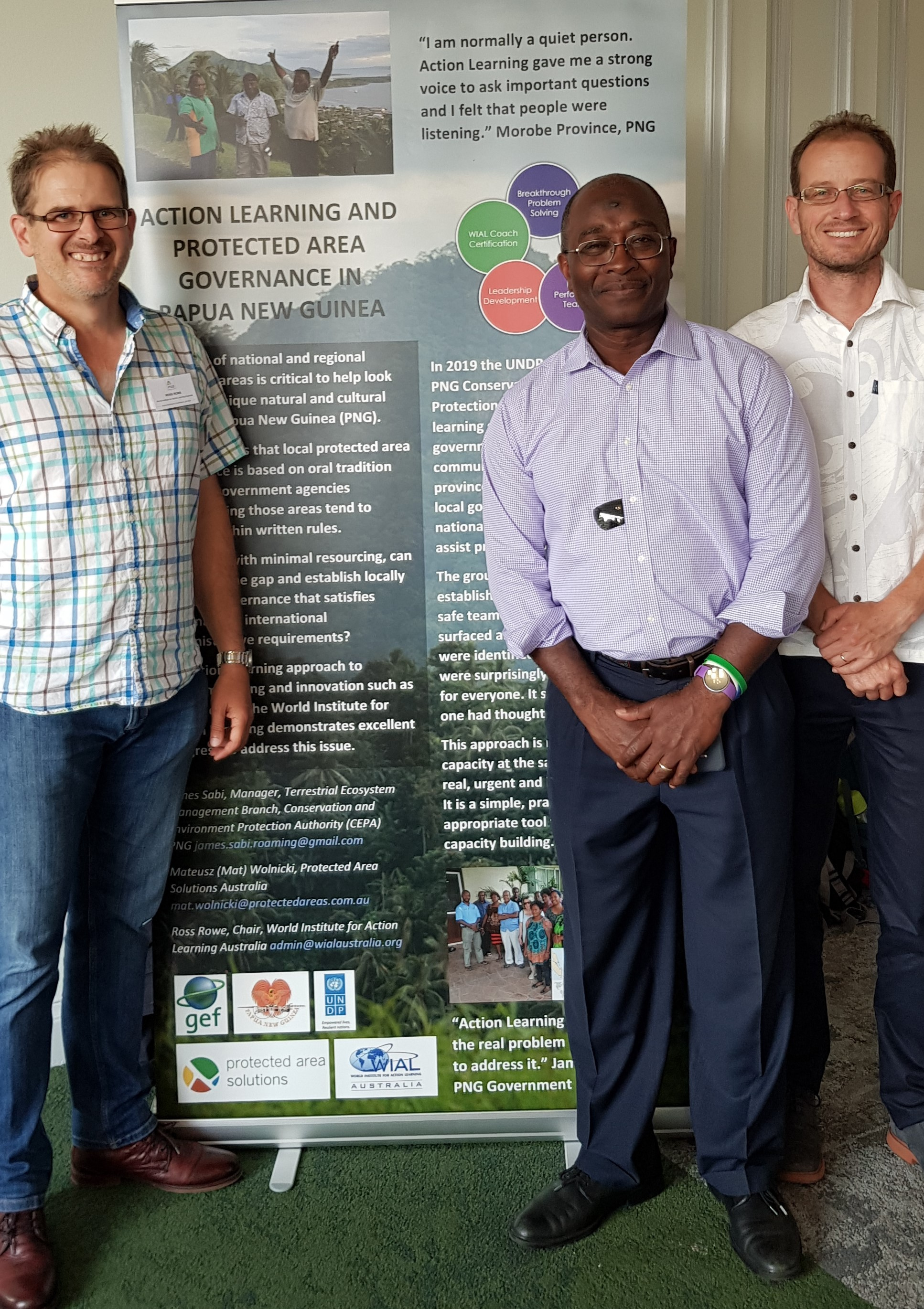 Ross Rowe (left) with Mohamed Bakarr of the Global Environment Facility USA (centre) and Mat Wolnicki of Protected Area Solutions Australia (right) presenting on the benefits of WIAL action learning for protected area conservation in Papua New Guinea at the Capacity Building for Conservation Global Conference London 2019. WIAL action learning is a team problem solving and innovation process that is inclusive, harnesses diversity, nurtures equity and intentionally builds capability (www.wial.org).