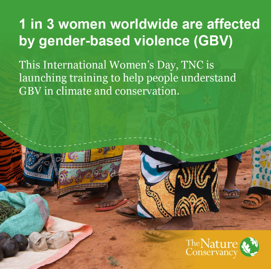 For International Women’s Day 2024, The Nature Conservancy is proud to launch dedicated training to address one of the most pervasive problems related to women and girls: gender-based violence (GBV). Around the world, in developed nations and emerging economies alike, 1 in 3 women are affected by GBV, and conservation is not immune. Conservation and climate programs that don’t consider gender inequality and which fail to understand gender and social norms can worsen conditions and even cause harm. We all have a responsibility to address this. |
