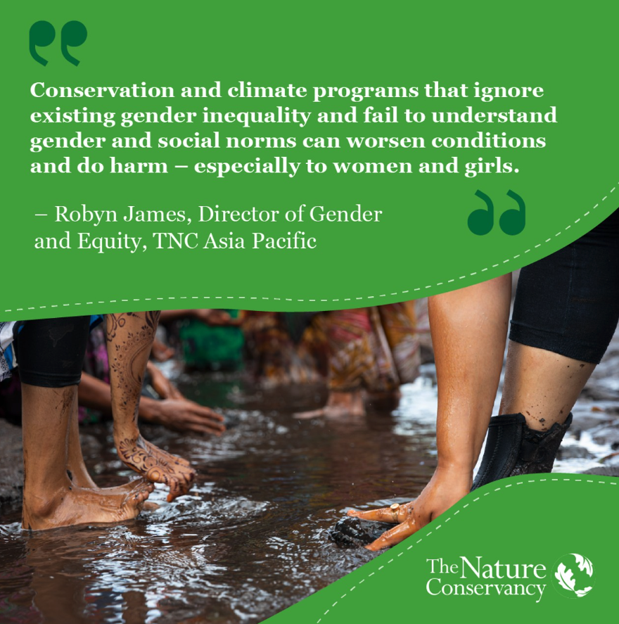 For International Women’s Day 2024, The Nature Conservancy is proud to launch dedicated training to address one of the most pervasive problems related to women and girls: gender-based violence (GBV). Around the world, in developed nations and emerging economies alike, 1 in 3 women are affected by GBV, and conservation is not immune. Conservation and climate programs that don’t consider gender inequality and which fail to understand gender and social norms can worsen conditions and even cause harm. We all have a responsibility to address this.  |