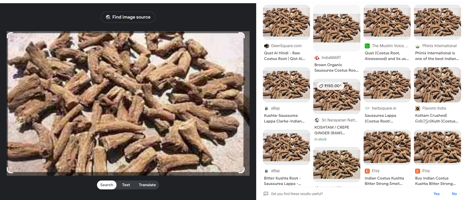 By reverse image search, it was found that this product is root of a medicicinal plant "Saussurea lappa" which is protected under "Appendix - I of CITES". Also, informations about other instances of this protected species being offered for sale on various social media, e-commerce sites were also detected. Now the law enforcement action can be planned and executed against all who are illegally trading in this protected species.