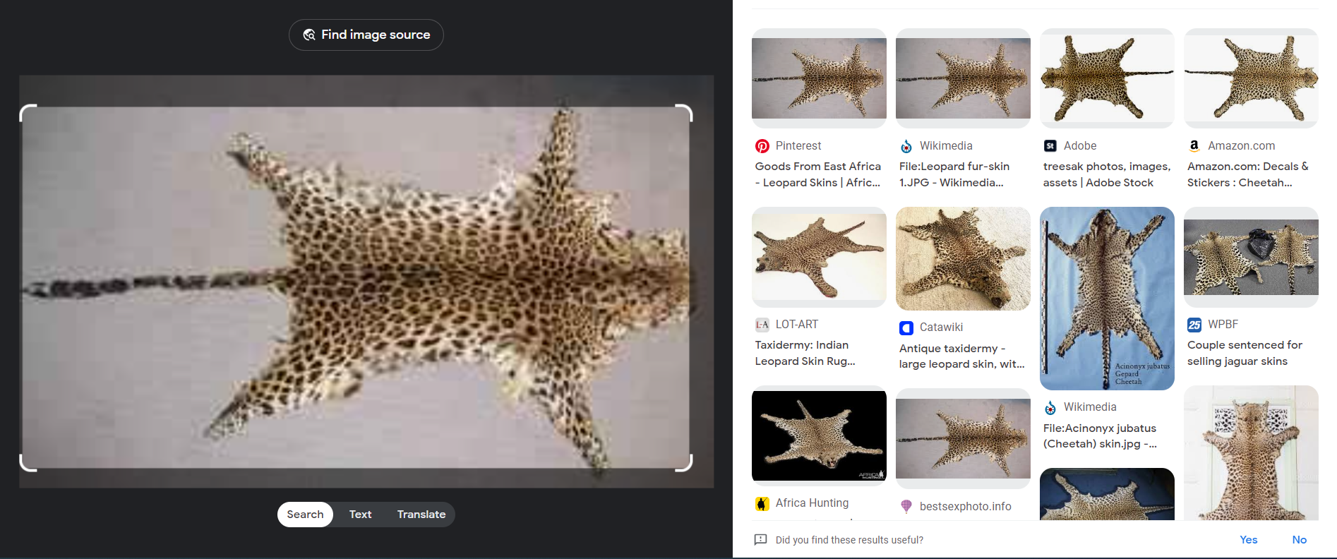Lots of cyber fraudters are also active on the cybersapce. For an undercover wildlife crime investigator on a cyberspace, he has to first ensure that the wildlife contraband offered for sale on digital platform is actually in possession of that person or he has simply taken the image of that wildlife contraband from internet and posted on some digital platform claiming possession of the same and his readiness to sale. Such fraudsters after taking advance money for supplying the wildlife contraband to the buyers disappear from the web. He can check this with the help of reverse image search tool. For example, suppose wildlife official comes across a Facebook post offering a leopard skin for sale. He has posted the following image of the leopard skin on his Facebook account: