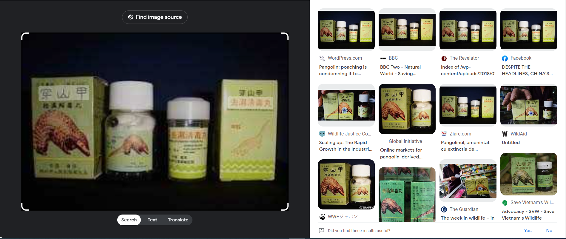 By reverse image search, the wildlife law enforcement officer finds similar images on various websites with detail description about the product which makes it clear that this product contains ingredients of "pangolin body parts" which is a critically endangered species and protected under "Appendix - I of CITES". Now he can take enforcement action against the perpetrator.