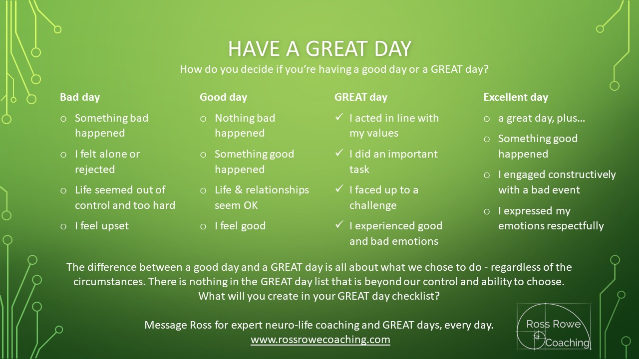 Thank you for sharing this Ross. I have been working recently on this and realising we have some level of choice to turn days around and focus on what was good about the day/week rather than what was bad.