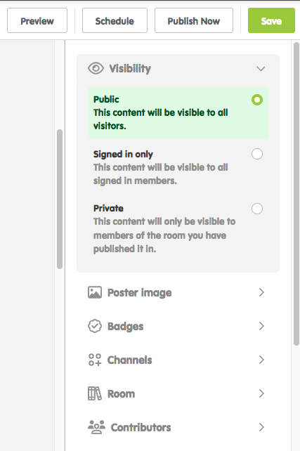 The visibility settings you will find at the top of the right-hand menu in your authoring page. Make sure to select "Private" if you are a member of a private room and you wish your content to be shared with members of the private room only. |