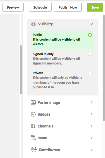The visibility settings you will find at the top of the right-hand menu in your authoring page. Make sure to select "Private" if you are a member of a private room and you wish your content to be shared with members of the private room only.  |