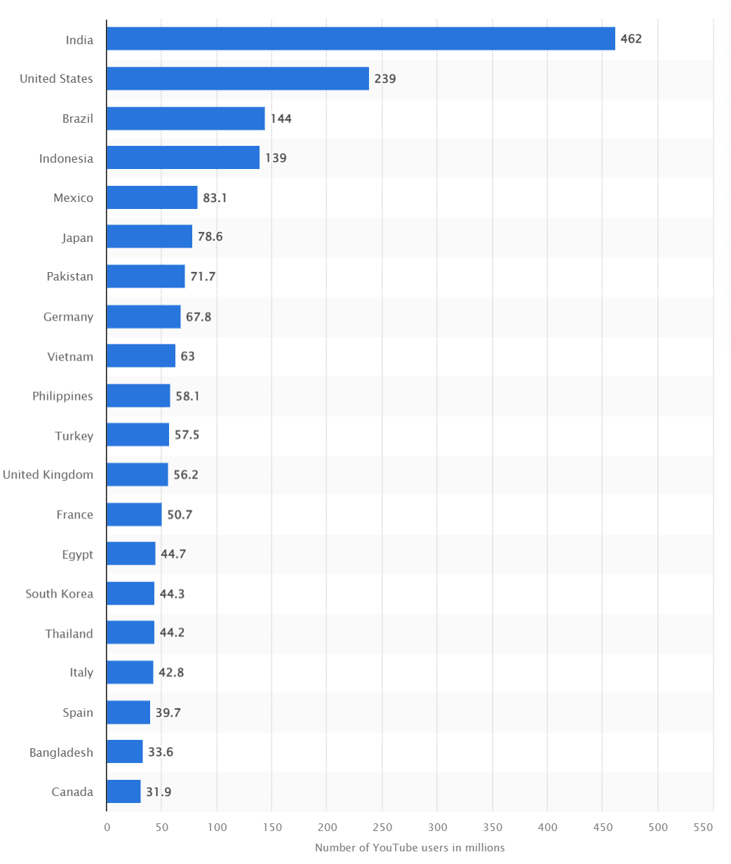 YouTube is the most popular social video platform. As of October 2023, India is the biggest market for YouTube with approximately 462 million active users followed by USA, Brazil and other countries as shown below. (https://www.statista.com/statistics/280685/number-of-monthly-unique-youtube-users/)