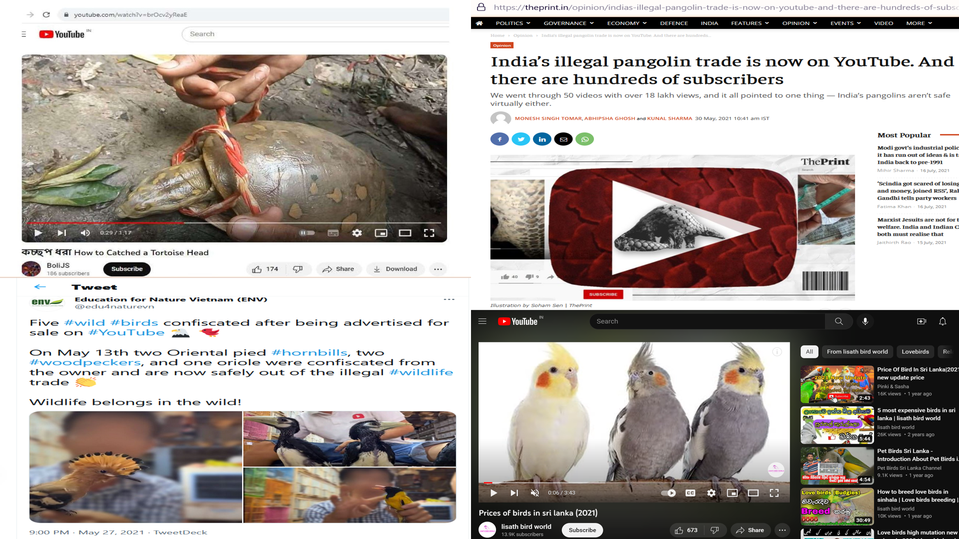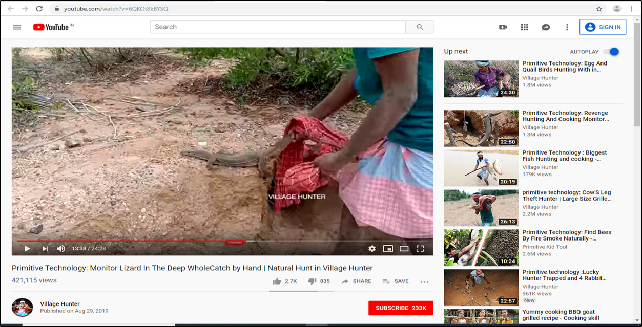 YouTube is the second most popular social media platform with 2.7 billion monthly active users. YouTube is behind Facebook only with 2.9 monthly active users. This world wide popularity and with such a large user base, YouTube has been exploited by wildlife traffickers also. Wildlife traffickers are creating their YouTube Channels and posting videos of poaching/hunting, cooking etc. of protected species of wildlife. They are also using YouTube Channels for advertising protected wildlife species, their parts, articles, derivatives etc. for sale.