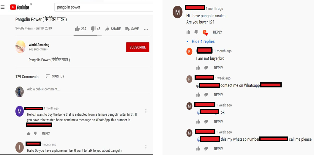YouTube has also been weaponized by wildlife traffickers as a marketplace for advertisement of wildlife contrabands for sale. In comment section of many such YouTube Channels, wildlife traffickers comment about wildlife contrabands in their possession and their readiness to sell them. Similarly prospective buyers enquire about availability of some wildlife contrabands they want to buy. They also share their WhatsApp numbers with each other so that they can further negotiate about the illegal wildlife trade privately and anonymously.