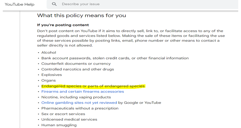 As per YouTube's "Illegal or Regulated Goods or Services Policies" making the sale of "endangered species or parts of endangered species" or facilitating their sale possible by posting links, email, phone number or other means to contact a seller directly is not allowed. But here also, there is a big gap in YouTube's Policies and their effective Implementation as wildlife traffickers keep exploiting YouTube Platform for illegal trade of endangered wildlife species and their body parts openly until they are brought to book by law enforcement agencies like WCCB.
