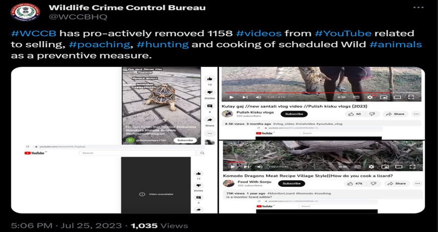Wildlife Crime Control Bureau (WCCB) of India has been on forefront in fighting the menace of wildlife crimes taking place on YouTube platform. Through Cyber Patrolling & Undercover Operations by its well trained Digital Detectives, WCCB has successfully been busting wildlife criminal activities on YouTube, getting wildlife contrabands seized and wildlife cyber traffickers apprehended.