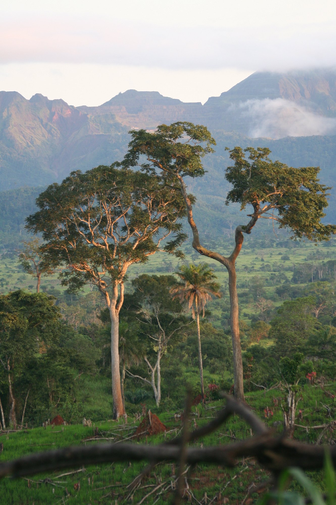 Humle-2005-Nimba degradation and LAMCO mine: View of the Liberian-American-Swedish Mining Company (LAMCO) iron mine in the Nimba Mountains in Liberia from the Guinean side. LAMCO ceased its mining exploitation activities in 1989. This photo illustrates clearly the long term impacts such large-scale development projects can have on the landscape in high biodiversity areas. The Nimba mountains are a transboundary area between Guinea, Liberia and Côte d'Ivoire which harbors a wide range of endemic species of fauna and flora, as well as a viable population of the critically endangered western chimpanzee.