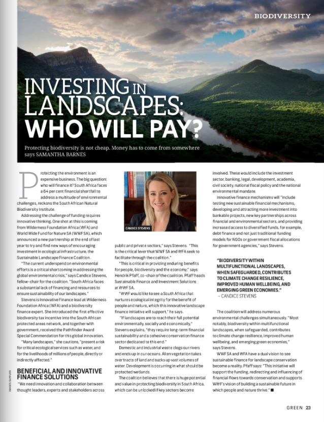 A piece by Candice Stevens, fellow-chair for the Sustainable Landscape Finance Coalition that aims to address the finance needs of conserving South Africa's landscapes and enhancing the sustainable economic opportunities they provide.