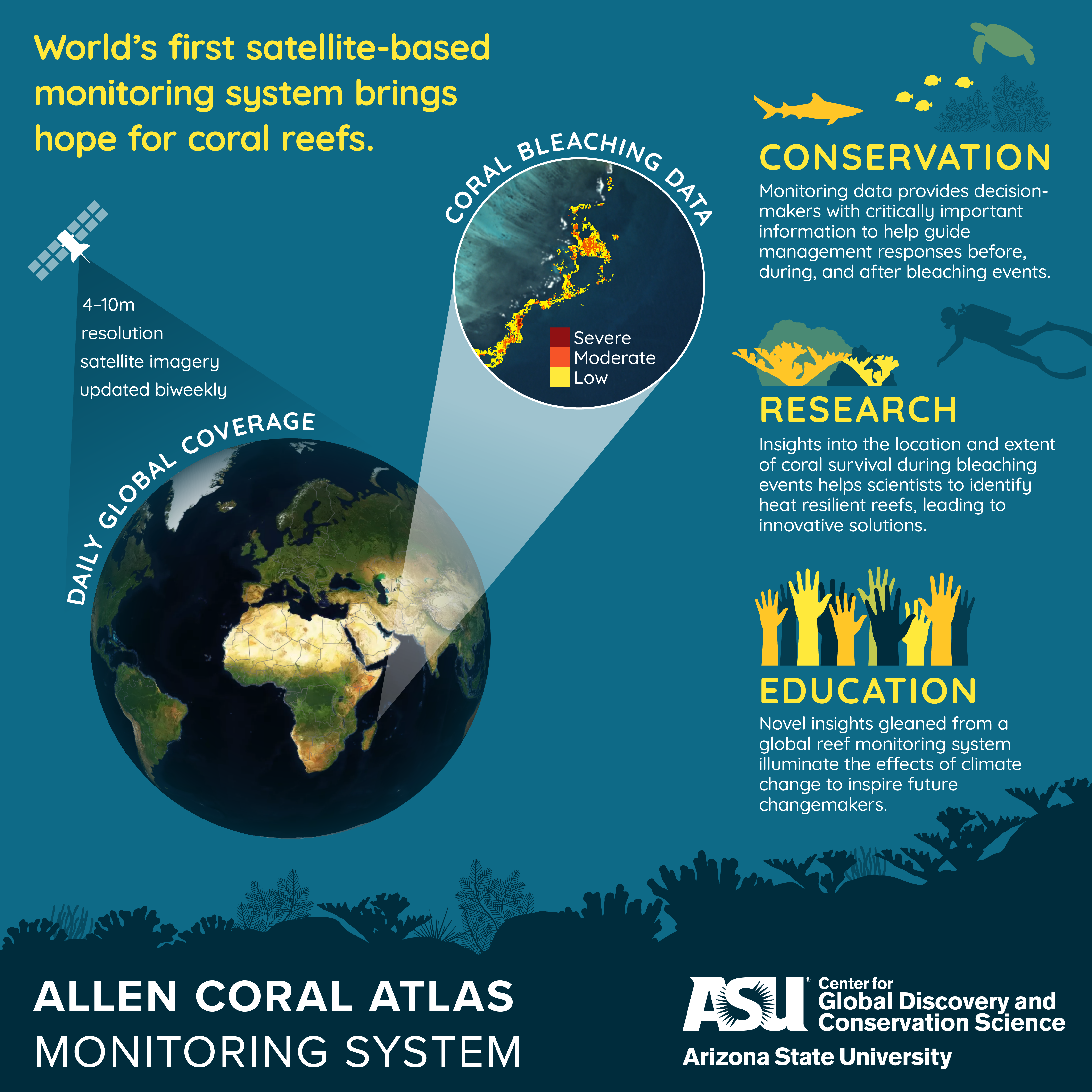 The Allen Coral Atlas has launched a unique satellite-imagery-based global monitoring system. The new Allen Coral Atlas Monitoring System will allow researchers, conservationists, and policy-makers to observe where corals are bleaching throughout the world, ranging from no bleaching to severe, based on biweekly and globally comparable coral bleaching data, for the first time. This innovative new tool represents a major step in our ability to support conservation efforts, promote research, and educate a new generation of scientists. Check out the new system here and read about the methods behind it on our Science and Methods section.