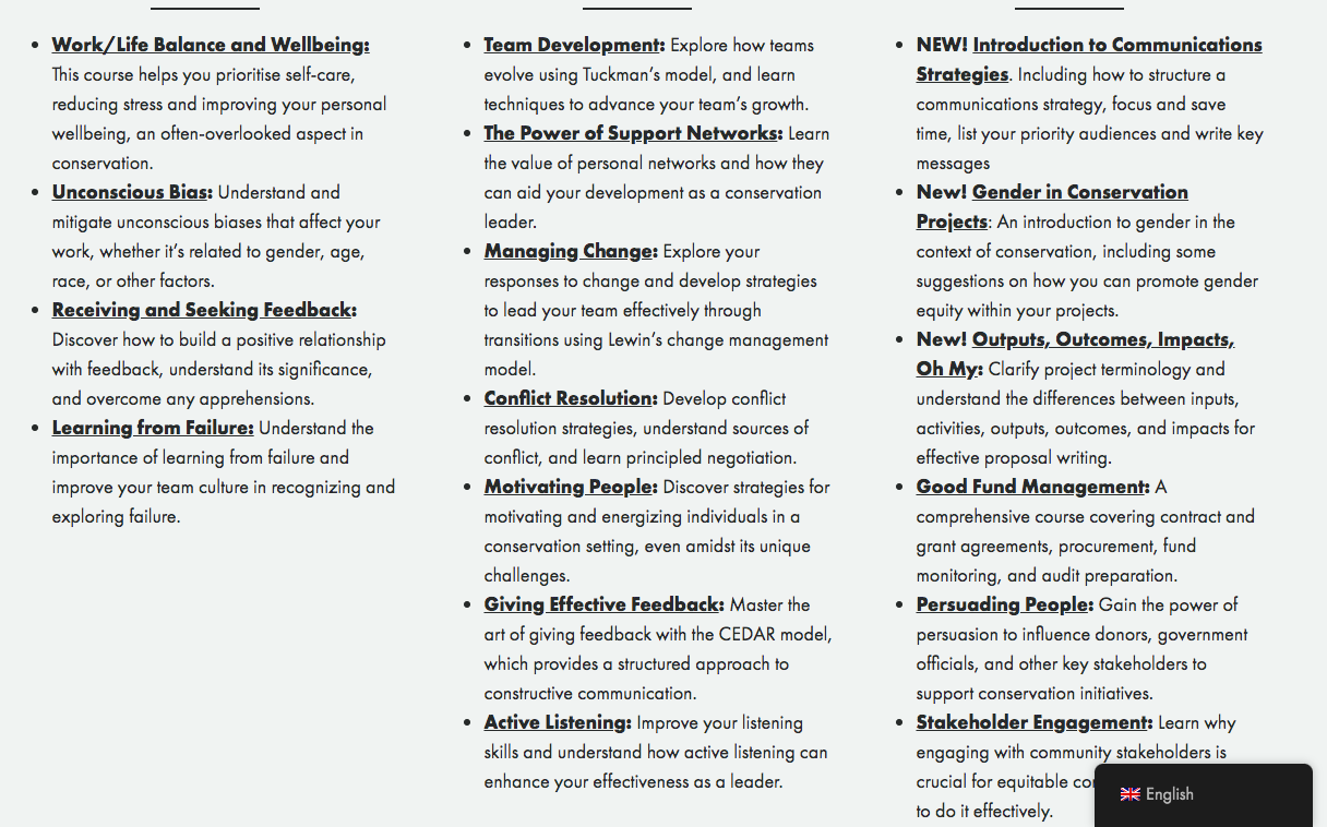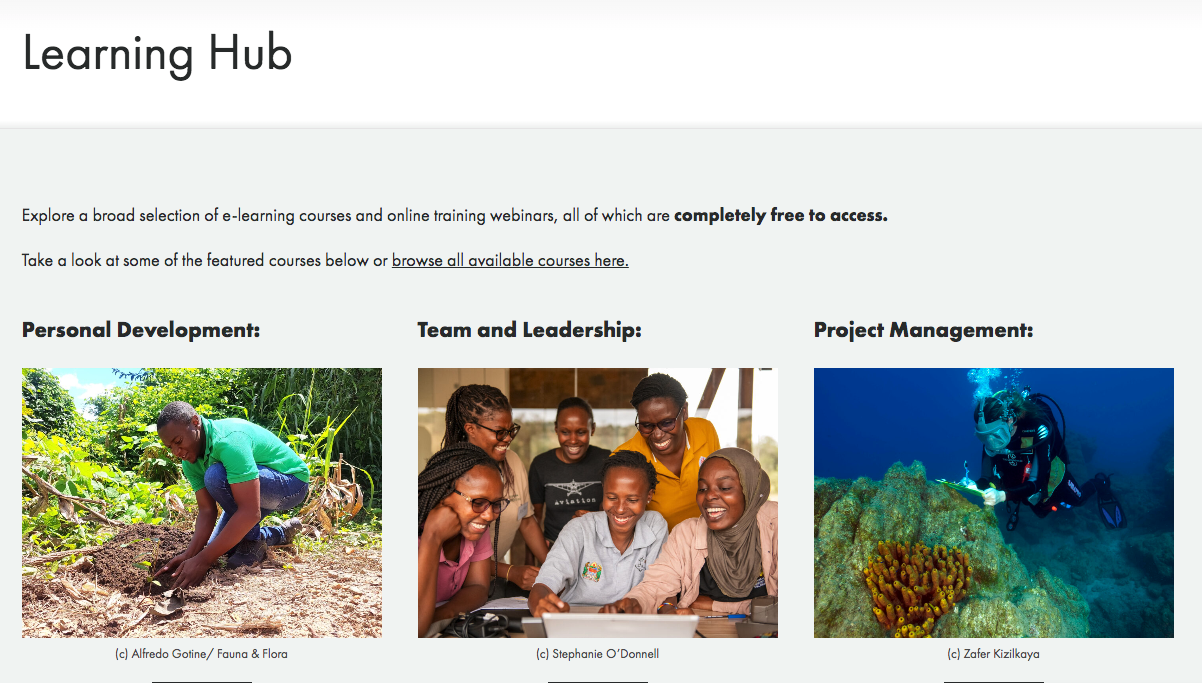 Hosted on its own dedicated website, the hub features over 20 original e-learning courses, authored by Fauna & Flora technical specialists. Courses cover a wide range of topics including creating a communications strategy, stakeholder engagement, grievance mechanisms, good fund management, conflict resolution, active listening, achieving work/life balance, learning from failure, effective strategies to motivate people and more. New courses are added continuously, including in languages other than English.