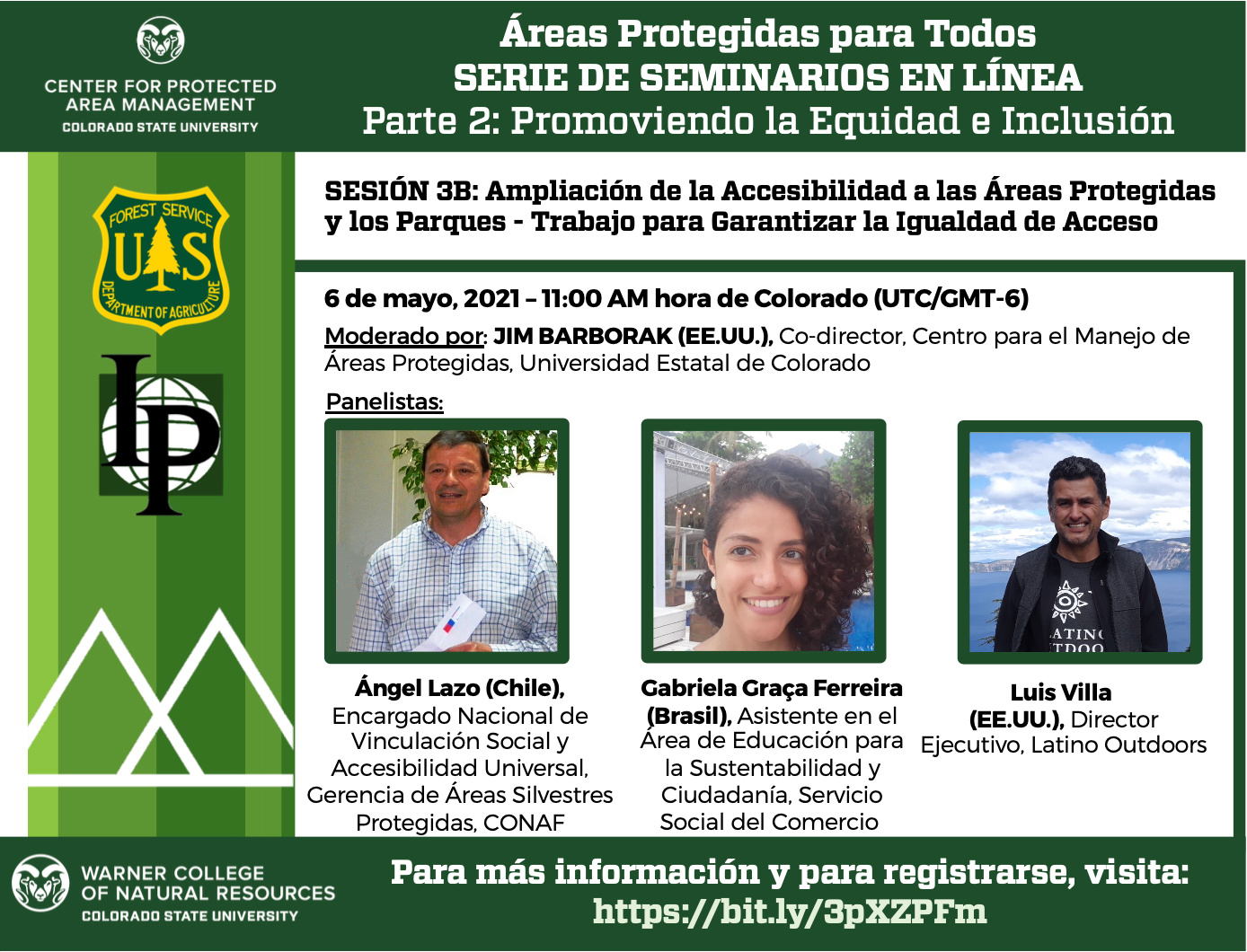 El Centro para el Manejo de Áreas Protegidas de la Universidad Estatal de Colorado y los Programas Internacionales del Servicio Forestal de EEUU se complacen en invitarles a un webinar sobre accesibilidad e inclusión en áreas protegidas, este próximo jueves. Ver el link abajo para registrase.