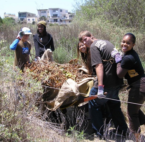 Image 3. Wetland restoration in progress as high school students remove non-native ice plants. Photo credit: Kelly Rose and Friends of Ballona Wetlands