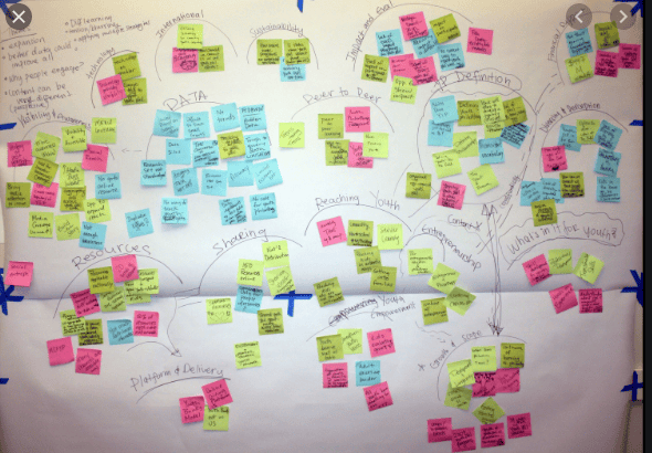 - Get everyone to contribute at least a couple of each colour and stick on a big wall. This ensures everyone contributes and its quicker/easier than getting everyone to write in a big document!
