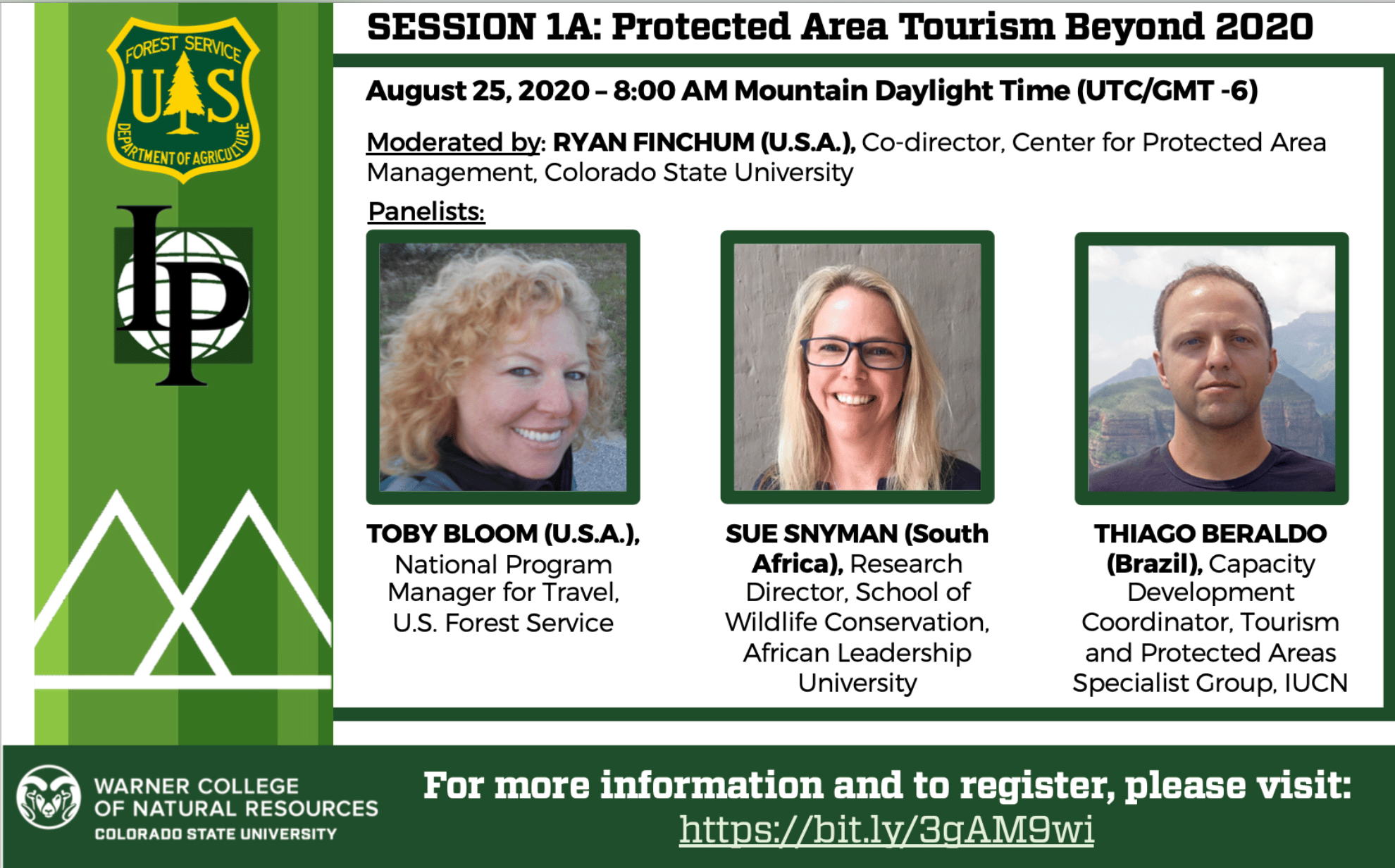Favor notar que se requiere registrarse para sesiones individuales de nuestra serie de seminarios en línea. Si la sesión del seminario en linea llega a la capacidad maxima de 500 personas el día del evento, puede visitar la página de Facebook https://www.facebook.com/centerforprotectedareamanagementpara ver una transmisión simultánea de Facebook Live. Si no puede asistir a las presentaciones en vivo, estarán grabados y disponibles también después en el Sitio Web de CSU-CPAM.