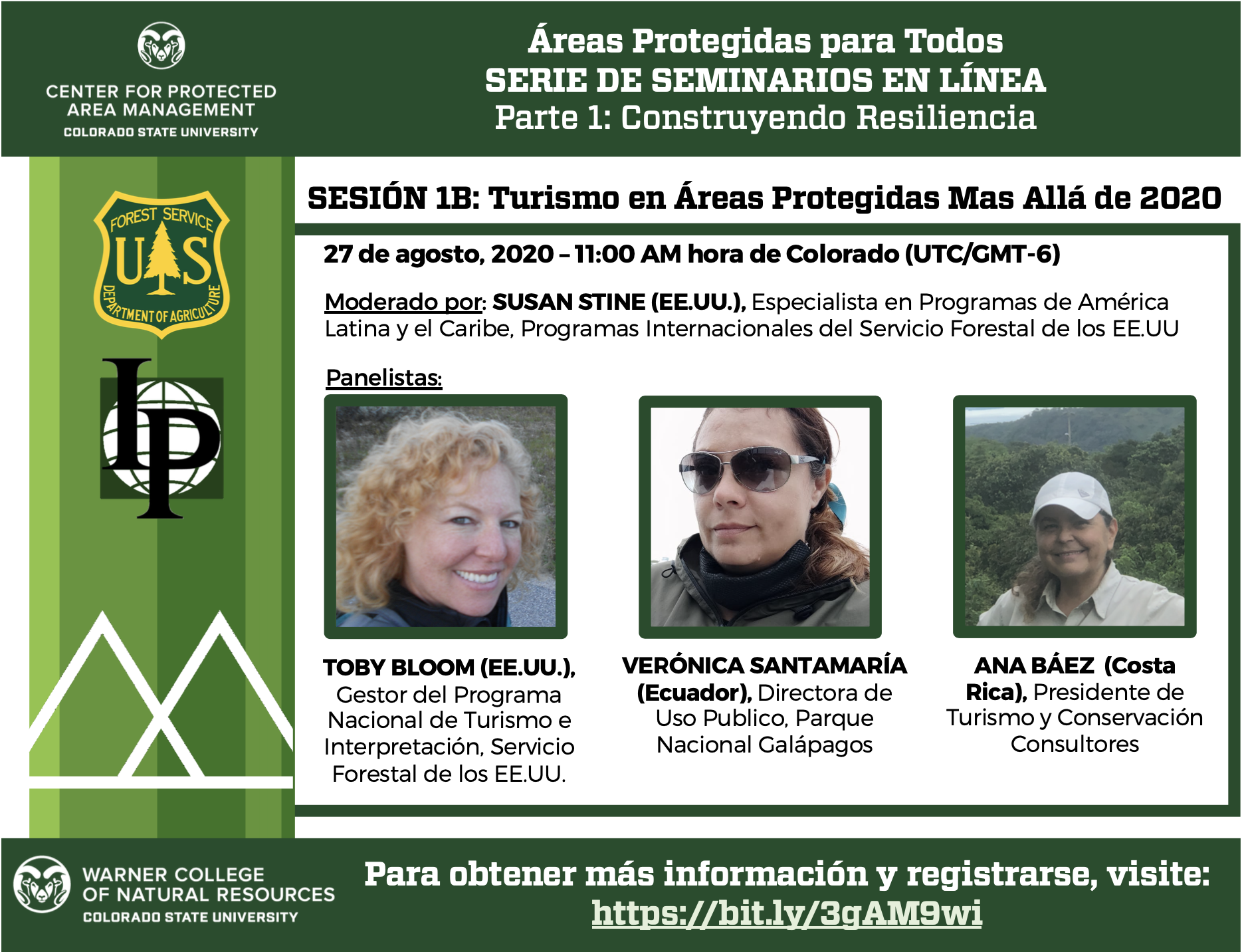 On behalf of Colorado State University's Center for Protected Area Management (CSU-CPAM) and our partners at the US Forest Service International Programs, we are excited to announce the first part of a 2-part bilingual (English-Spanish) webinar series, "Protected Areas for Everyone."