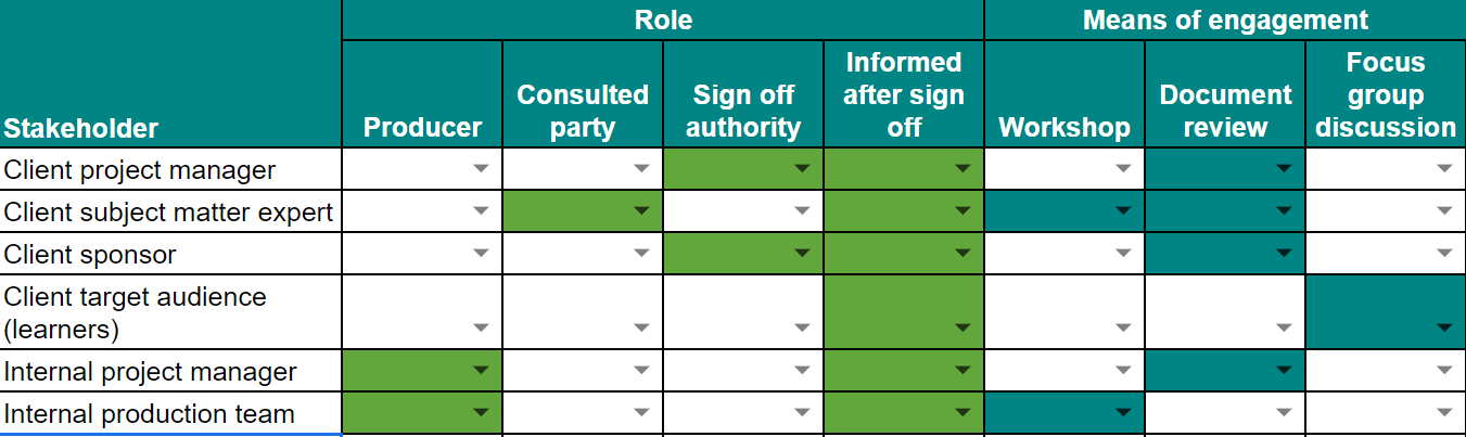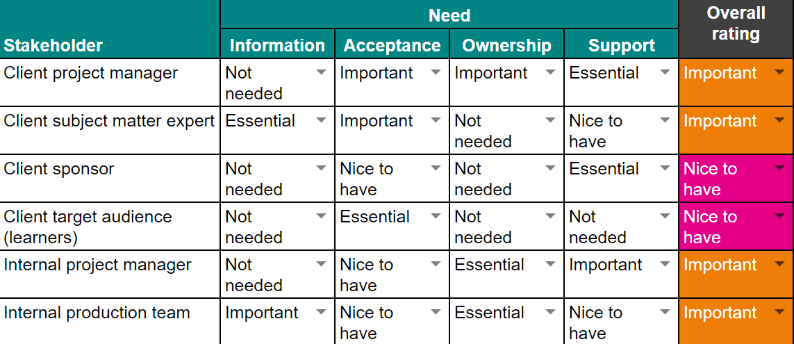 For this exercise, I used examples of stakeholders from the kind of project I work on in my day job, developing e-learning courses, since I don't have direct conservation experience.