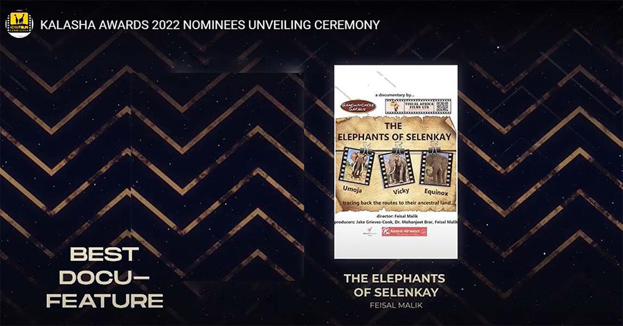 We are truly humbled and pleased to let you know that our documentary THE ELEPHANTS OF SELENKAY has been nominated in the Best Documentary (Feature) category for the Kalasha Awards 2022…