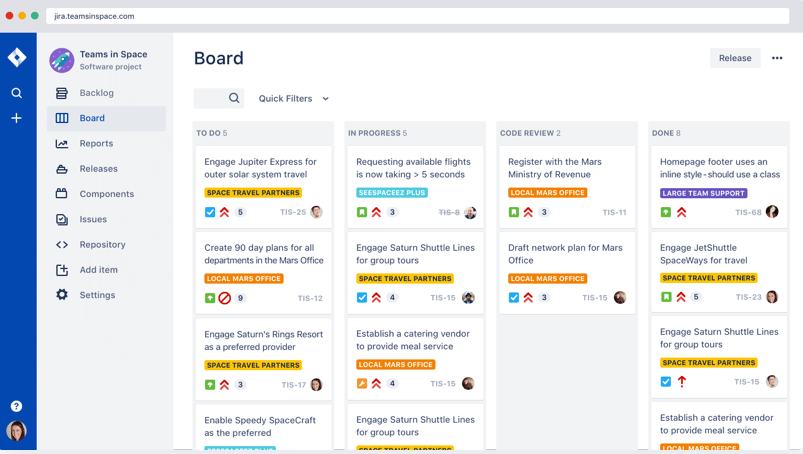 Jira - (made by the same company as Trello) - really great for agile projects but can also work for managing milestones/tasks too. Excellent for technical projects as can link to software releases etc. Items are managed in a Kanban view and so move from left to right as they progress (example image below). You can title the columns whatever you want to fit your project and create as many as you need. This makes it really obvious which tasks are progressing and which are blocked. The downside is that board requires a lot of management, maintenance, updates to ensure things keep moving along. Might be useful for anyone working on more technical conservation projects.