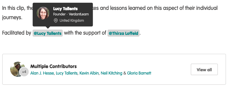 When viewing content or conversations which have @mentions included, you can hover over the mentioned member with your cursor to see an expanded card with more of the member's profile information visible, and some options to get in contact with them directly: