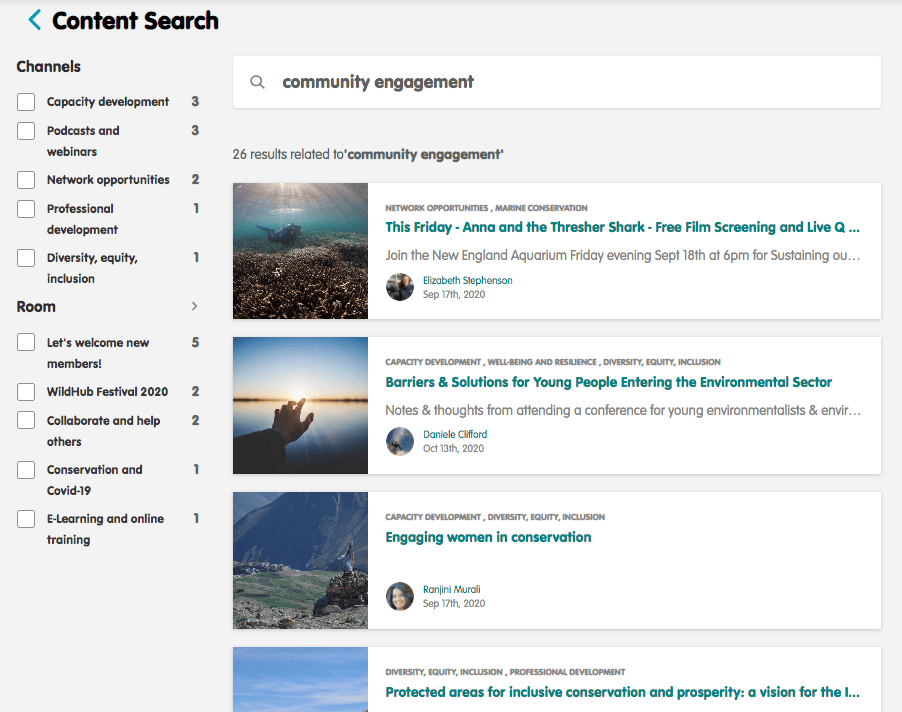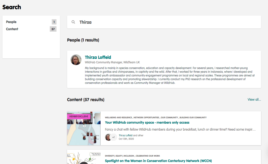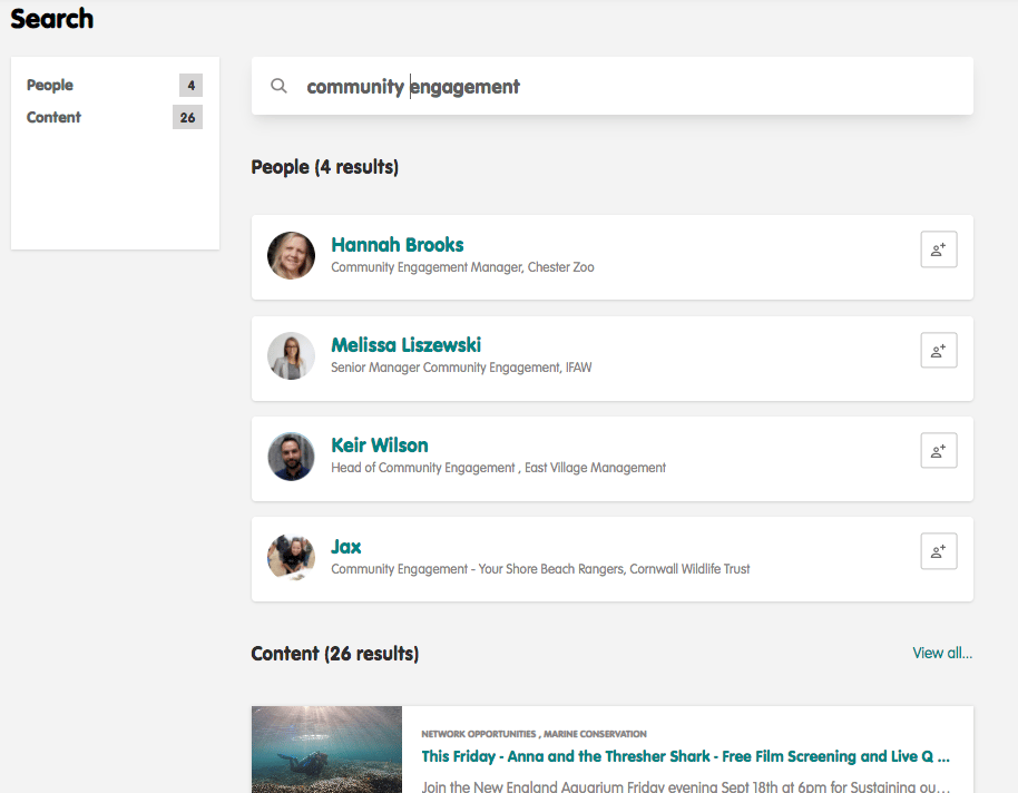 By searching for 'community engagement' the search has returned members who have 'community engagement' in their job title, plus all content related to the term.