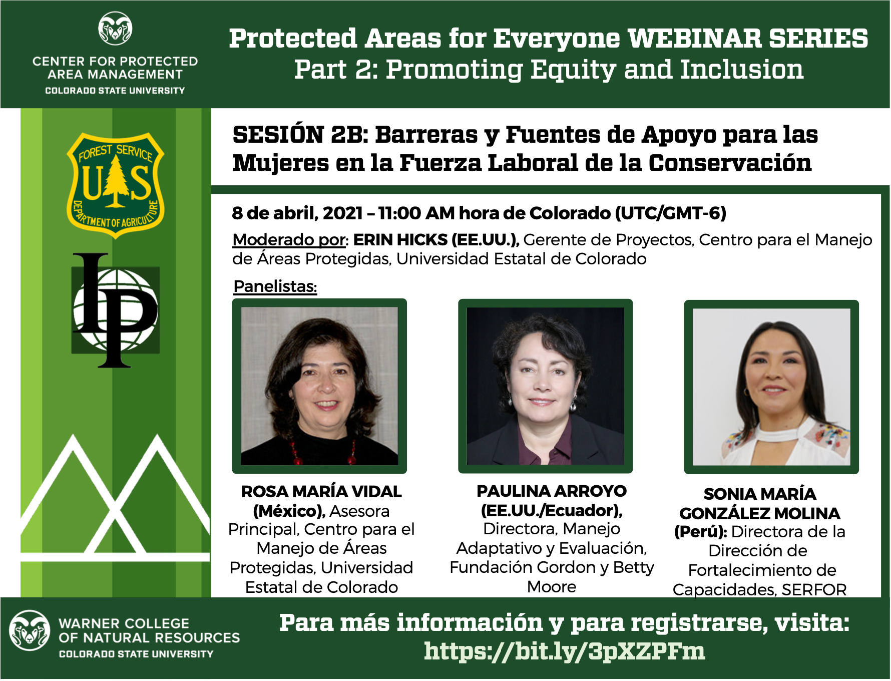 Estimados y estimadas colegas: El Centro para el Manejo de Áreas Protegidas de la Universidad Estatal de Colorado y los Programas Internacionales del Servicio Forestal de EE.UU. presentan otro webinar sobre los desafíos que confrontan las mujeres que trabajan en la conservación, el 8 de abril.