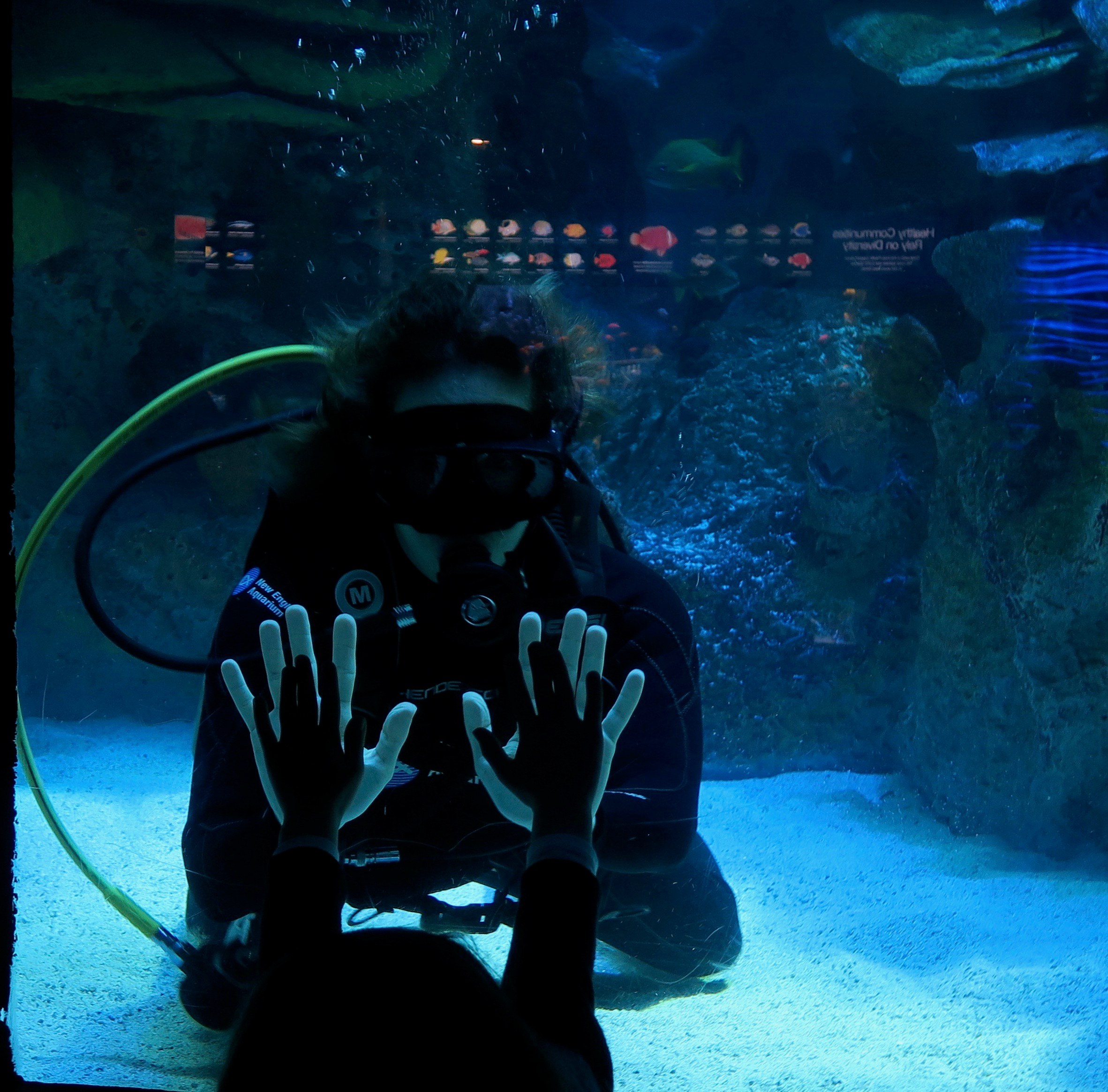 MCAF Fellow Kerstin Forsberg (Peru) shares a special moment with her daughter while diving in NEAq’s Giant Ocean Tank. Photo: Elizabeth Stephenson