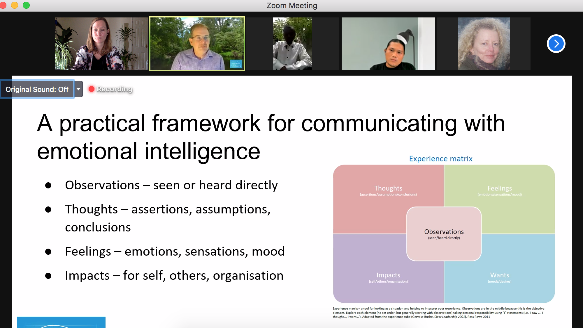We opened our festival this year with an interactive workshop organised by professional coach and WildHub Key Creator, Ross Rowe, on Communicating with emotional intelligence (link to recording), who facilitating this session from Australia. Ross was assisted by WildHub member, Fahri Budiman, who is assistant In-situ Conservation Division Manager at Yayasan Ekosistem Lestari in Indonesia. Together they presented a practical framework for clear communication that includes observations, impacts and feelings, which I have personally used  in my daily interactions since this workshop - a vital part of our 'toolbox' as conservation professionals, in my opinion! The workshop recording also includes input and insights from our members Kay Farmer, Eden Plummer, and  Ussi Abuu Mnamengi - who tuned in from the UK and Tanzania.